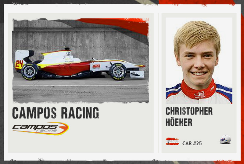 eintrug. Info Juni 2015 - Start for Campos Racing on the F1 GP weekend in Silverstone Campos Racing add Hoeher to Silverstone round line-up. Austrian driver joins Spanish squad. Campos Racing approaches a new round of the GP3 Series, this time taking place at Silverstone. This is also popularly known as “The Home of British Motor Racing”. A new driver will join the outfit for this round. Austrian Christopher Höher, aged 18 and born in Villach, has initiated an agreement to drive one of the Campos Racing-entered cars this weekend. The Dallara GP3/13 to be driven by Höher is that used by Samin Gómez previously. Höher had his first taste of the series last year, when he took part in two races. His racing career has been linked to different Formula 3 series, both at national and international levels.