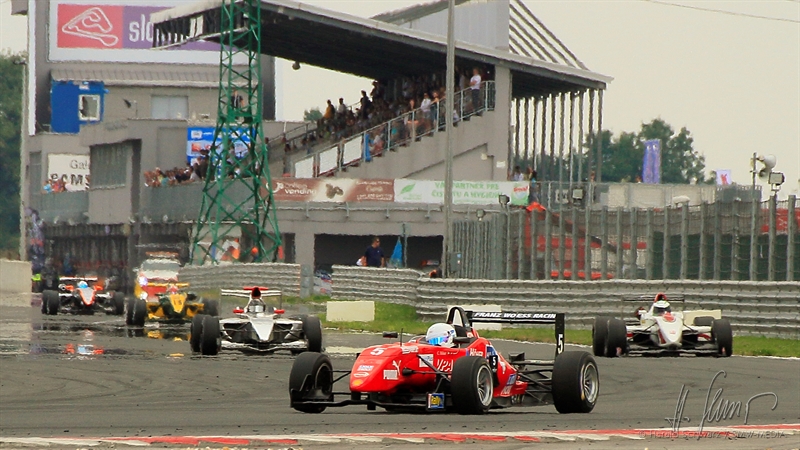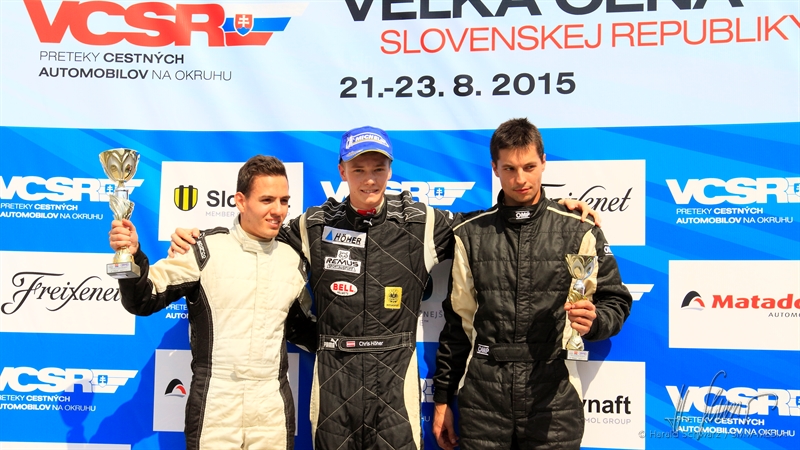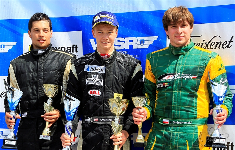 vor Magyar und Smiechowski. Chris Höher: „Beim Qualifying hat mein neuer Satz der Michelin-Slicks sehr gut funktioniert. Schon in der Aufwärmrunde spürte ich, dass ich meine Zeit von gestern wesentlich verbessern werde können. Im Rennen gelangen mir konstant schnelle Rundenzeiten. Ich musste die gesamte Distanz sehr konzentriert fahren. Einen Fehler konnte ich mir nicht erlauben. Schon mit der geringsten Abweichung wäre Magyar an mir vorbei gewesen, denn sein Formula Master war auf den langen Geraden verdammt schnell. Mit den Punkten aus den beiden Siegen gelang es mir, den Abstand zu Smiechowski in allen drei Championaten wieder etwas zu vergrößern. Doch im Trockenen sind die Meisterschaften noch nicht. Diese entscheiden sich erst beim Finale in Brünn.“